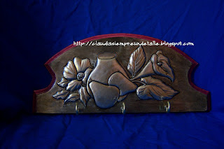 Porta llaves con diseño de fruta, jarrón y flores en color cobrizo que también se le puede dar uso para colgar toallas de cocina.